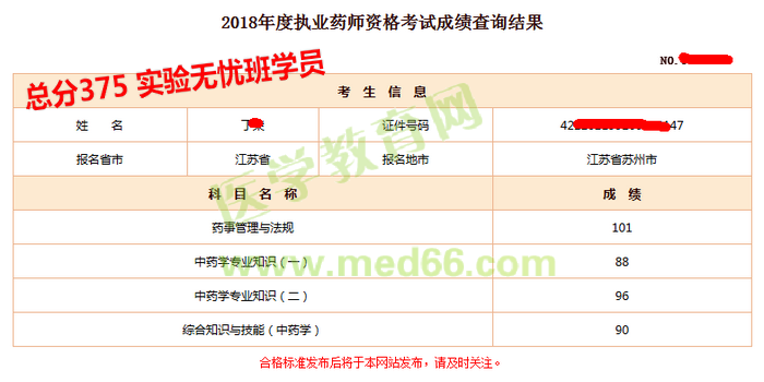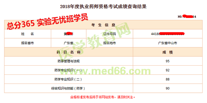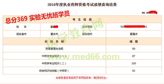四科全过!总分369!单科最高分100!四科平均分92.25!2018年实验无忧班学员! 目前医学教育网执业药师虽已无实验无忧班,但是,目前推出了更加深得学员喜欢的班次:双师取证班!专业师资授课+教辅直播督学!报名不过,协议!