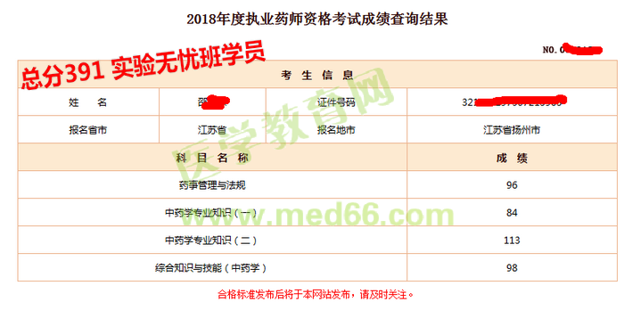 四科全过!总分390!单科最高分100!最低分95,很厉害!2018年实验无忧班学员! 目前医学教育网执业药师虽已无实验无忧班,但是,目前推出了更加深得学员喜欢的班次:双师取证班!专业师资授课+教辅直播督学!报名不过,协议!