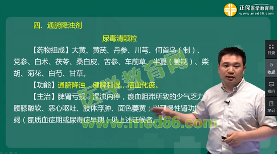 考点18.某男,50岁。患慢性肾功能衰竭(尿毒症早期),症见少气乏力、腰膝酸软:恶心呕吐、肢体浮肿、面色萎黄,证属脾肾亏损、湿浊内停、瘀血阻滞。医师处以尿毒清颗粒,此因该成药除通腑降浊、活血化瘀外,又能:健脾利湿