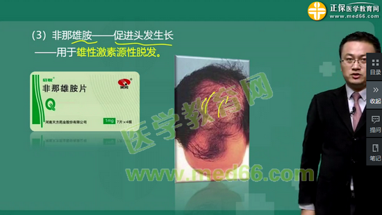 考点54.大剂量用于治疗良性前列腺增生,而小剂量能促进头发生长,可用于雄激素源性脱发治疗的药物是:非那雄胺