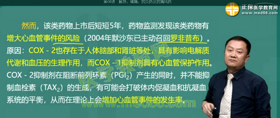 考点15:选择性COX-2抑制剂罗非昔产生心血管不反应的原因是: 阻断前列环素(PGI2)的生成但不能抑制血栓素(TXA2)的生成