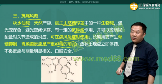 考点32:从百合科植物丽江山慈菇的球茎中得到的种生物碱,能抑制细胞有丝分裂,有一定的抗肿瘤作用,可以控制尿酸盐对关节造成的炎症,可在痛风急症时使用的药物是: 秋水仙碱