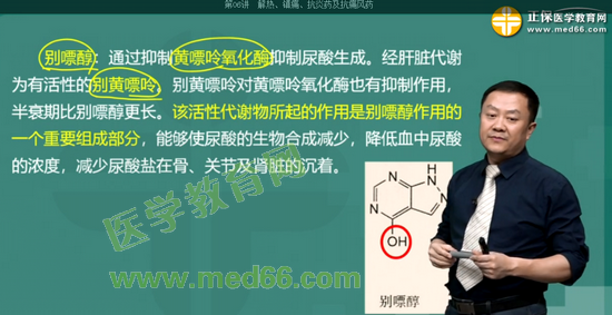考点33:通过抑制黄嘌呤氧化酶而抑制尿酸的生成,在肝脏中可代谢为有活性的别黄嘌哈的药物是: 别嘌醇