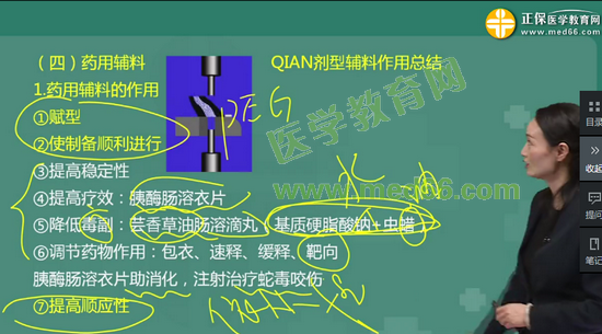 考点38:药用辅料的作用有:使制剂成型;使制备过程顺利进行;降低药物毒副作用;提高药物疗效;提高药物稳定性