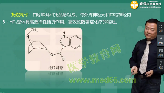 考点44:分子中含有吲哚环和托品醇,对中枢和外周神经5-HT3受体具有高选择性拮抗作用的药物是