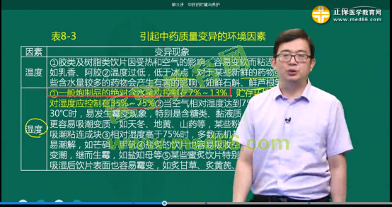 考点9.湿度是影响药物质量的一个重要因素,不仅可引起药物的物理和化学变化,如含水量,外观形态,化学成分发生改变等,而且能影响微生物的繁殖及害虫的生长。一般中药炮制品的质量控制和贮藏要求应是:绝对含水量应控制在7%~13%,贮存环境的相对湿度应控制在35%~75%.