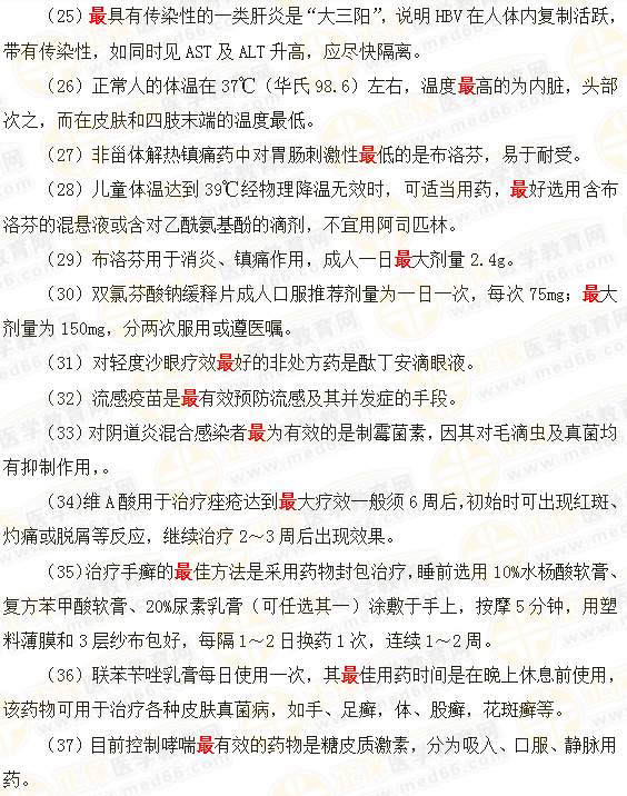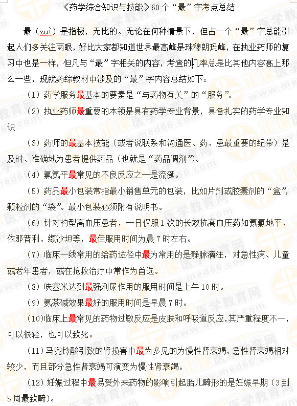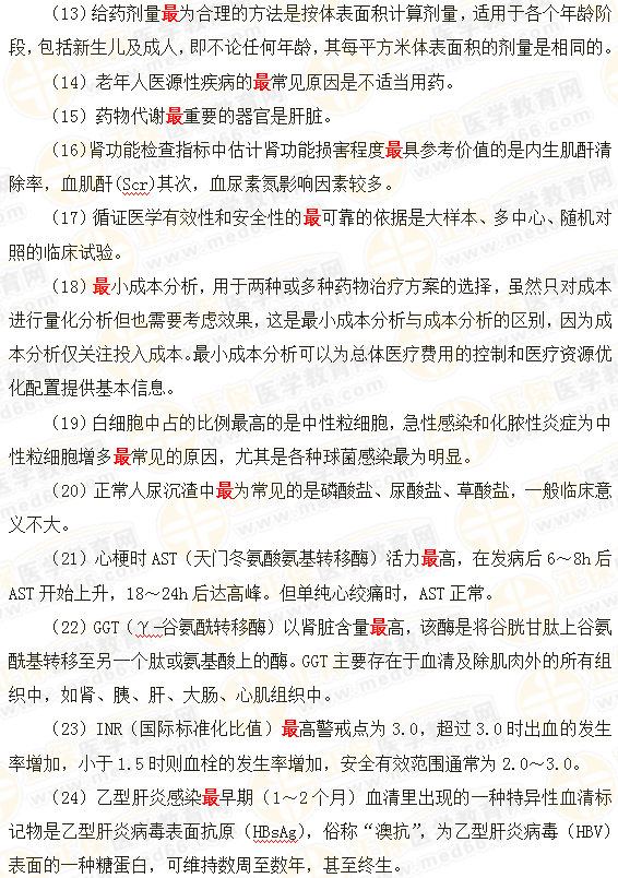 以上即为“执业药师《药学综合知识与技能》60个“最”字考点总结(一)”的全部内容,希望对您有用,第二部分将在近期更新,请关注医学教育网!