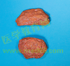 为块状或粒状集合体,呈不规则块状。深红色或橙红色,条痕淡橘红色,晶面有金刚石样光泽。质脆,易碎,断面具树脂样光泽。微有特异臭气,味淡。