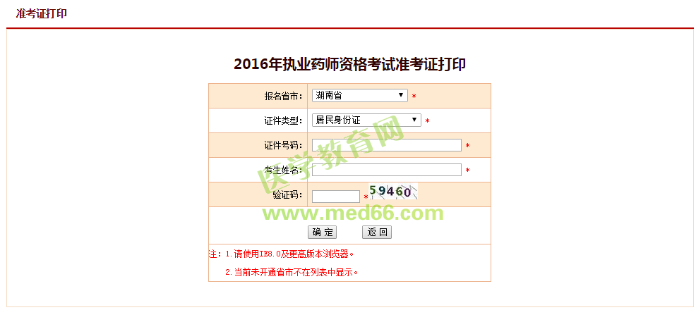 湖南省2016年执业药师考试准考证打印入口: