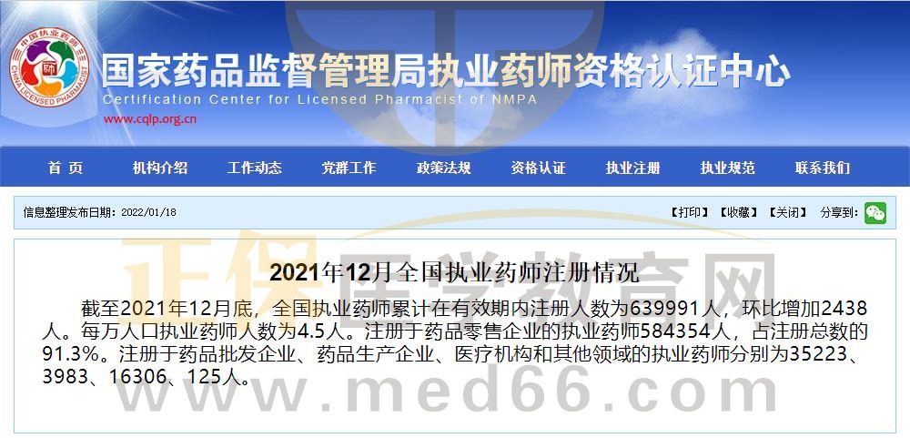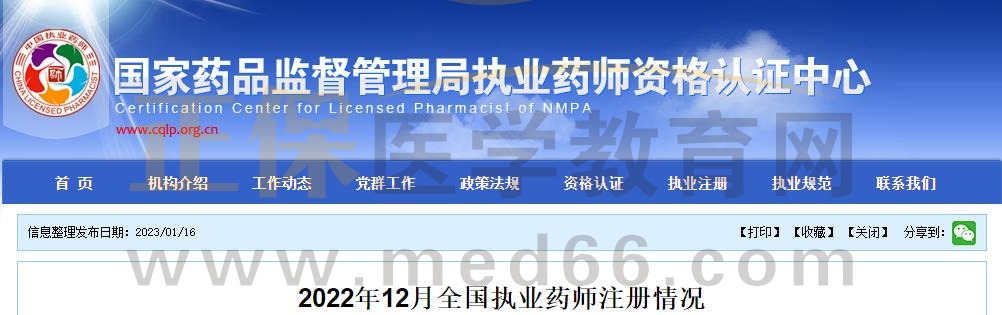 近期,国家药品监督管理局执业药师资格认证中心发布了《2022年12月全国执业药师注册情况》,具体通知内容如下: