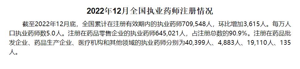 截至2022年12月底,全国累计在注册有效期内的执业药师709,548人,环比增加3,615人。每万人口执业药师数5.0人。注册在药品零售企业的执业药师645,021人,占注册总数的90.9%。注册在药品批发企业、药品生产企业、医疗机构和其他领域的执业药师分别为40,399人、4,883人、19,110人、135人。