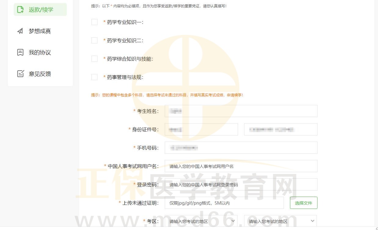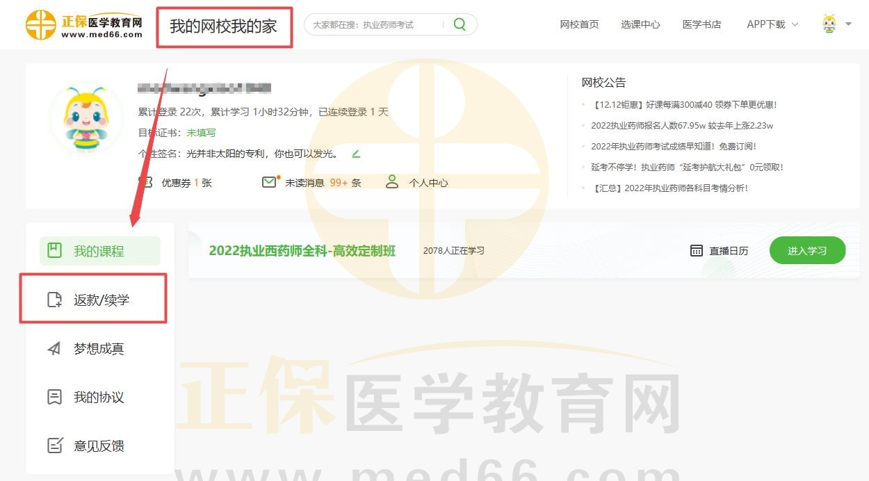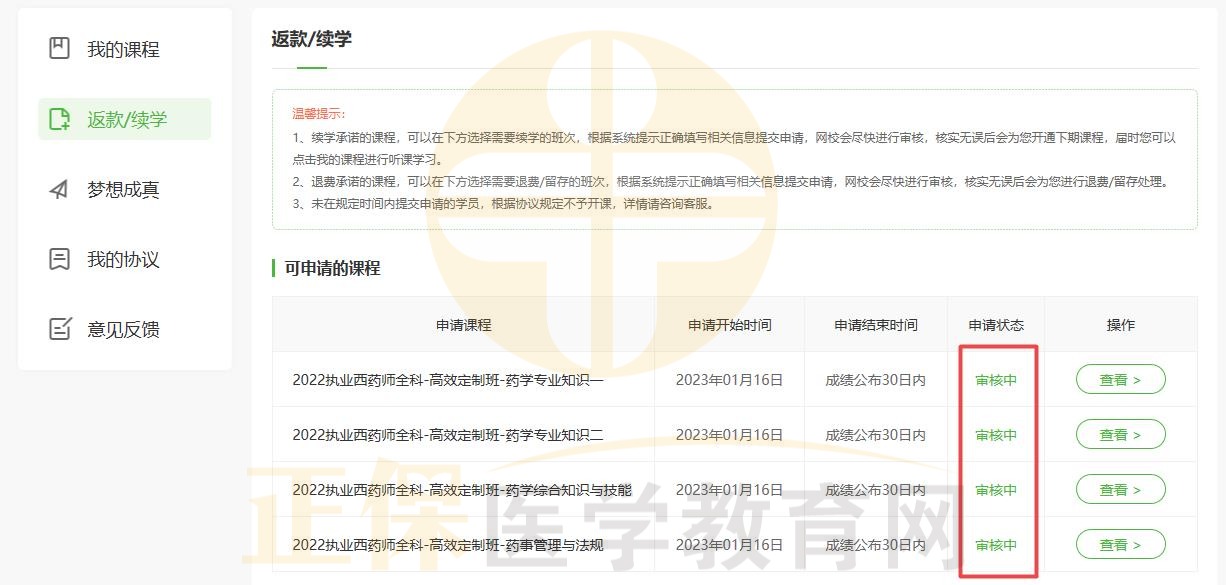 各位2022年执业药师(补考)考生请注意!2022年执业药师(补考)无忧实验班、高效定制班、VIP签约特训营A班、VIP签约特训营A班(续学)、VIP签约特训营B班返款/续学入口已开通了!购买以上班次且在2023年3月份执业药师(补考)中未通过的学员,可及时申请返款/续学,具体操作方法如下: