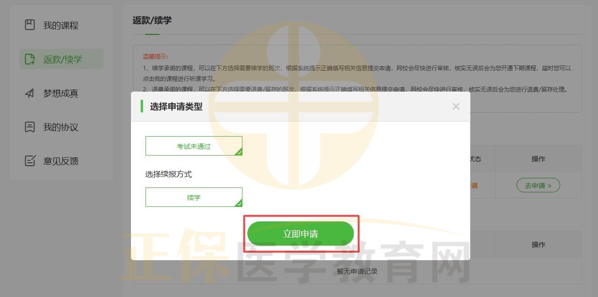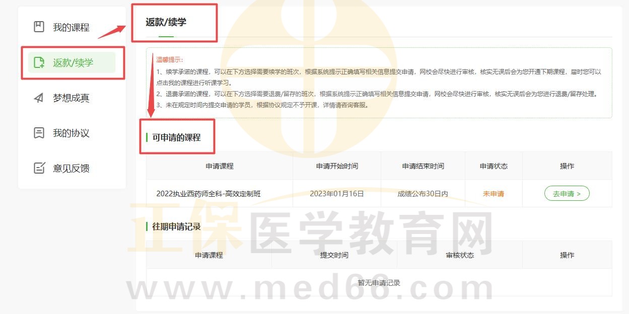 2、在“返款/续学”中找到可申请的课程,点击“去申请”。