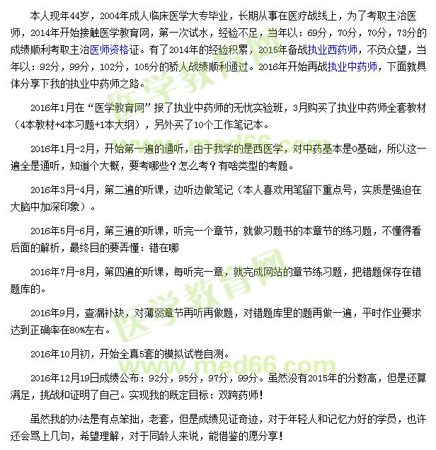 2016年我的执业药师之路大型有奖征文活动火热进行中,医学教育网学员积极参与,为我们带来了很多精彩的文章,医学教育网执业药师学员wf7***25根据自己参加2016年执业药师的经历写了这篇:《2016我的执业药师之路--再战中药师》,让我们一起来见证他的执业药师之路吧!