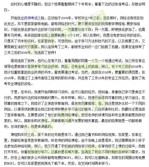 时间过得飞快,转眼间,考试结束,成绩出来,结果一如当初预料的相差不大,毕竟,有老师辅导,跟自己摸索是有很大差别的,而网络培训视频的使用,也带来了很大的便利性和方便性!所以,一路走来,半年多的网络视频学习,感觉是很好的!在此感谢医学教育网以及各位培训的老师,特别是景晴老师!女神级别的培训师!