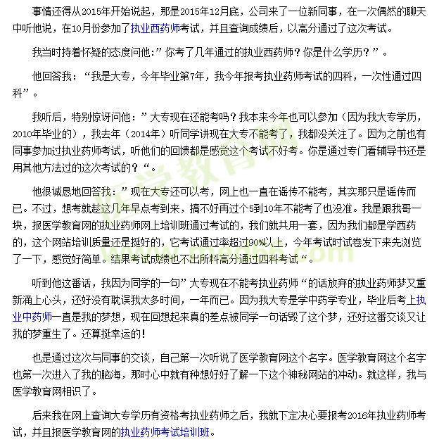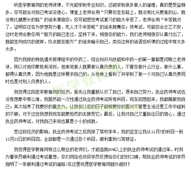 我叫林南山,是2016年医学教育网的学员。2016年,我在医学教育网老师们专业负责的辅导下,加之自己辛勤的付出,一次性通过了执业中药师考试中所有科目。12月19日查完分数,打开医学教育网,看到网站有“2016我的执业药师之路“的征文活动,我抑制不住内心的那份喜悦,十分期待跟大家分享我在医学教育网学习的感受。下面我通过文字好好跟大家分享一下我在医学教育网学习的切身感受吧。