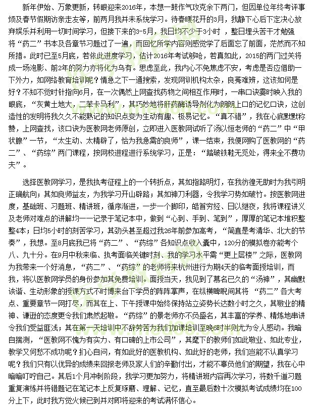 2016执业药师考试尘埃落定,在医学教育网的精心组织、周密安排及老师们的辛勤耕耘、谆谆教诲下,我终于以药二107分、药综96分的优异成绩顺利通过考试(注:2015执药考我已通过另2门),捧上我梦寐以求、翘首以盼的执业药师证书。