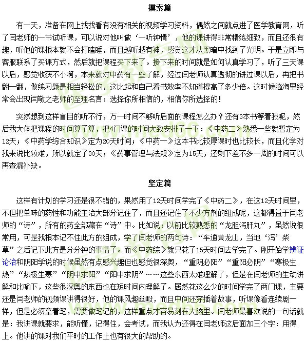 2016年,我通过了执业中药师的考试,说起自己的执业中药师考试之路,从开始的迷茫困惑到后来坚定信心的过程,这期间的个中滋味只有考过的人才能够体会。总之,是累并快乐着,累是因为学习过程是相当辛苦的,我们这行工作没有节假日,每天都要上班,晚上再晚睡觉,早上六点必须起床,很多时候也想赖床也想放弃,遇到困难也彷徨过、犹豫过,最后还是坚持了。后来离考试时间越来越近,心里就越是忐忑,基本上所有可以利用的时间都在学习,但是还是感觉时间太少,有些东西始终记不住,就连晚上做梦都还在做练习题,可能这就是传说中的“走火入魔”吧!为什么说还有快乐呢?知识的增长积累过程是快乐的,而且我的执考之路非常顺利,第一次报名就成功,从报名到考试也就只用了短短三个月时间就通过了四门学科的考试,这点同行们觉得我很厉害,但是我认为我很幸运,是因为我选择了医学教育网,是医学教育网的老师们给我带来了坚定的信心,为我指引了方向,我才能这么顺利地通过了考试。以下是我执考路上的点点滴滴,与大家分享。