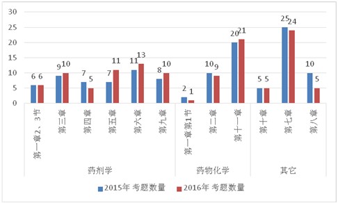《药学专业知识一》包括三大部分:药剂学、药物化学和其它(药效学、药物分析和不良反应监测),今年让学员最头疼的药物化学部分仍然考了30分左右,大约占总分值的25%,与去年相当。而药剂学部分今年相对加大了考核比例,由去年占比40%提高到了45%,主要是在第5、6、9章上增加了题目。而去年让人感觉最惊艳的第7章药效学今年仍然是独占鳌头,占据了20%的分值。各章整体分值比例和2015年相比没有太大变化。