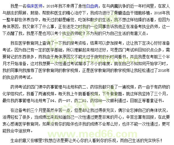 2016年我的执业药师之路大型有奖征文活动将于3月31日截止,希望准备参加的学员不要与丰厚的奖励参加而过。下面医学教育网小编为大家分享一下由医学教育网执业药师学员根据自己参加2016年执业药师的经历写了这篇:《我的执业药师考试之路--快乐就好》,让我们一起来见证她的执业药师之路吧!
