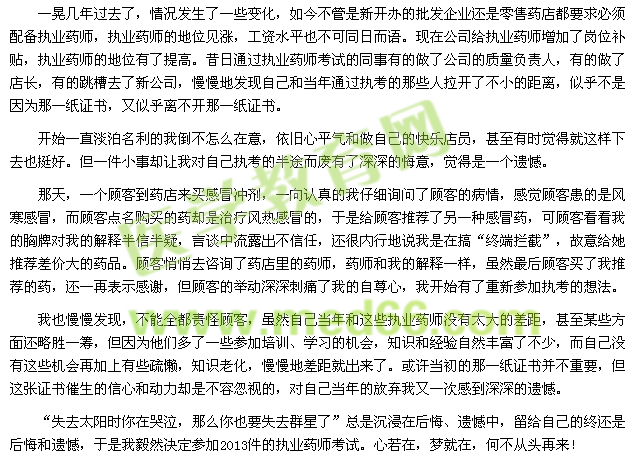 编者按:在2013年我的医考之路大型征文活动中,医学教育网学员积极参与,为我们带来了许多精彩的文章,现在让我们一起来看一下,网校执业药师考试学员根据自己参加2013执业药师考试的经历写的这篇:《执考让我重拾激情》。