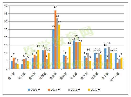 通过对试题的梳理,分析近四年试题各章节分值比,发现今年《药事管理与法规》分值分布情况稍有变动,其中第五章和第十章分值下降了4分,第八章分值下降了5分;而第六章,分值增加了10分,第三章和第四章均增加了4分。对于中药的管理考察有所加强,其他重点章节变化不是很大,第五章为重中之重,对于处方、处方药、非处方药的考查依然是重点。