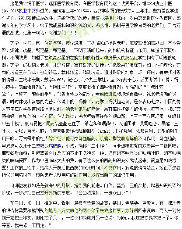 从开始的茫然不知所措,医药化学一点基础都没有,心里一点底气也没有。有了医学教育网,这个良师益友。以简驭繁,提纲挈领。一下把课程犹如树干、树枝、枝叶,清晰直观梳理出来。顿时有“独上高楼 ,望断天涯路的感觉” ,顿时豁然开朗,自信心十足。紧接着,是艰苦卓越的学习时间,为了梦中的情人“伊”,衣带渐宽人不悔。披星戴月,利用工作之外一切业余时间,夏练三伏,挥洒汗水。一次次梦里都是在学习、做题。日常工作中,每当把学习的知识运用到实践中,深入浅出,行知合一。给患者以满意的专业服务。顿时感悟到知识的价值,体会到知识就是要运用到实践中,回归社会,返璞归真。“众里寻他千百度,蓦然回首,那人却在灯火阑珊处”。