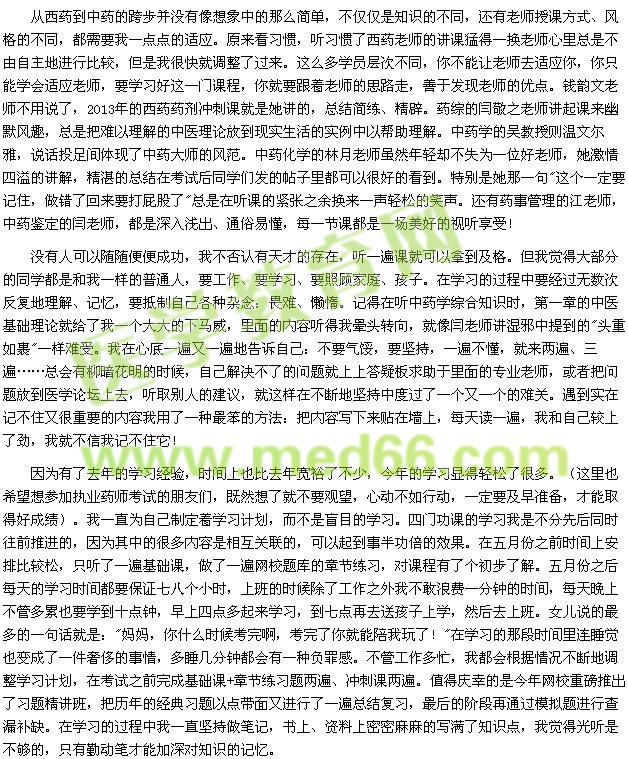 去年在成绩出来的第一周,我就毫不犹豫的又报名参加了执业中药师的课程,同时也鼓励我身边几个屡考不过的朋友报了医学教育网,我相信医学教育网也会帮助他们成功的。当学习变成了一种习惯、一种享受的时候,你已经离不开她了,你再也回不到以前,除了上班工作就是拉闲话无所事事的日子了,只有学习才会让你变得充实!