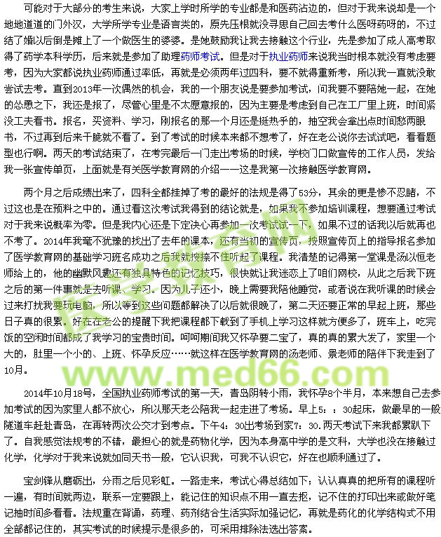 2014年末的最后一天我收到了一份最好的礼物。记得那天晚上6点多钟的时候正在吃晚饭,我的手机邮箱收到了来自医学教育网的一条信息,提示说山东省的执业药师考试成绩已经公布可以查询。要知道这是我期盼已久要得到的信息。心里有点激动也很害怕。按照提示输入姓名、身份证号进行查询之后好一会都没敢看结果,幸运的是我竟然一次性通过四科考试,当时我的心情别提有多高兴了,哈哈心里的石头终于落地了——感谢医学教育网成就了我。