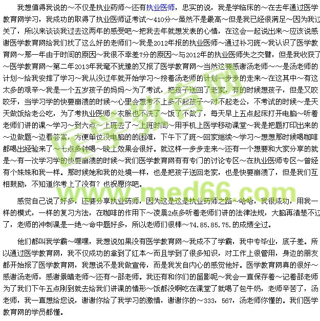 现在医学教育网就像是我的生活必须品,每天都得打开看看,不看难受,我想我的职称考试,都是毫无疑问的。感谢医学教育网,感谢你们带给了我的好运。谢谢你们,所有的老师们~好了,我把所有想说的话都说了,在这新的一年开头里。我祝医学教育网越办越好。