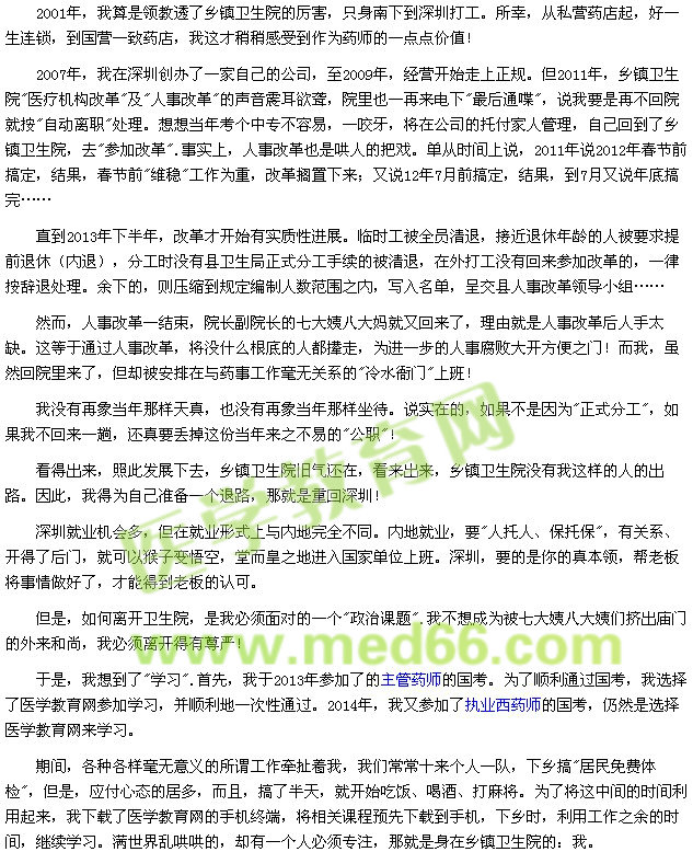 如今,主管药师证也考过了,执业药师考试也通过了。接下来,我已经与母校取得联系,计划参加药学大专的学习,然后再专升本。不为别的,一是为了在卫生院上班,保持起码的尊严,不做"哈巴狗".二是如果卫生院进一步黑暗,我也可以毫不客气地讨个说法走人,无需担心没有退路。三是学习可以让人更加坚强,让人克服懒惰和消沉,适应时代的需要。