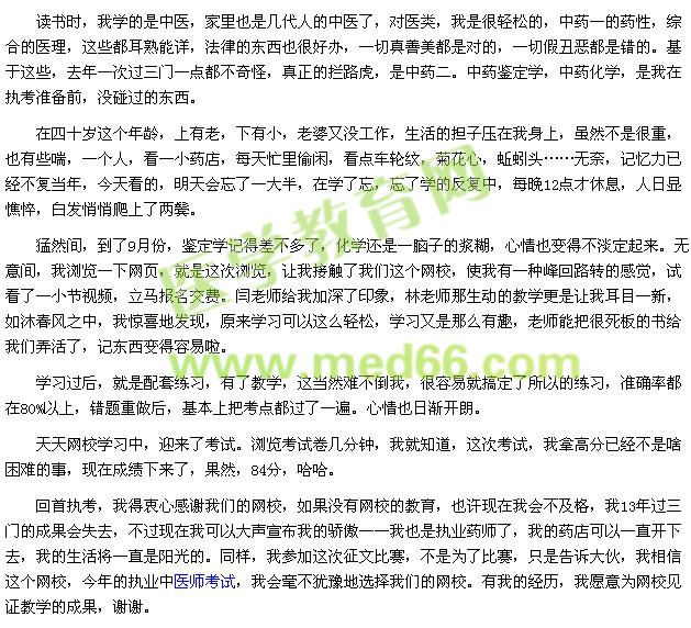 等待,只需要等待,我的执业药师证到手,我就是执业助理医师与执业药师双能人才。考试过后,一切的激情都归与平静,在好好地休息了许久之后的今天,回到网校来浏览,发现这个征文比赛,本着实事求是与对网校负责的态度,我来说说我的执考之路。