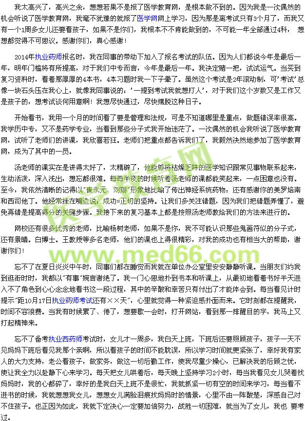 我爱网校,我爱我家。2015年的执业医师我又报名了,希望和你一起再次创造一个奇迹。最后,衷心祝愿网校今后越办越红火,为我们许许多多的医学考生提供更多的的帮助。