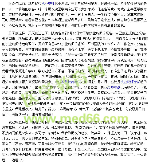 2015年1月6日,陕西省的执业药师考试成绩出来了,药一88分,法规87分,综合87分,药二60分,虽是低分通过四科考试,对我奔四的人来说,已经很知足了,内心的喜悦真是无法形容。在此,我想告诉大家,我自己的专业技能实践考试也通过了。也许这就是"医药不分家"的结果,执业药师的学习,为自己职称考试奠定了一定的基础,比如:昨天答辩时自己抽了一道题目是:高血压患者心血管危险分层标准。哈哈,这不是景晴老师药学综合知识上强调的内容,真是很幸运!在这里,我特别感谢汤老师、雷教授、杨树老师等的所有老师,每一个老师都有自己的讲课特点,只要自己认真听,收获都很大。感谢医学教育网,感谢医学教育网的老师们,你们辛苦了。医学教育网,因为有你,我的人生更精彩,医学考试路上更加顺畅!