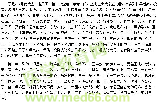 12月31日,成绩出来了,77分,我过了,分数对于我来说还不低,很满意了,心中充满了对老公孩子还有医学教育网的感激!谢谢!还有我自己——新晋妈妈,孩子那么小,克服太多的困难才取得的成绩!一份耕耘,一份收获,No pain,No gain,此言极是!