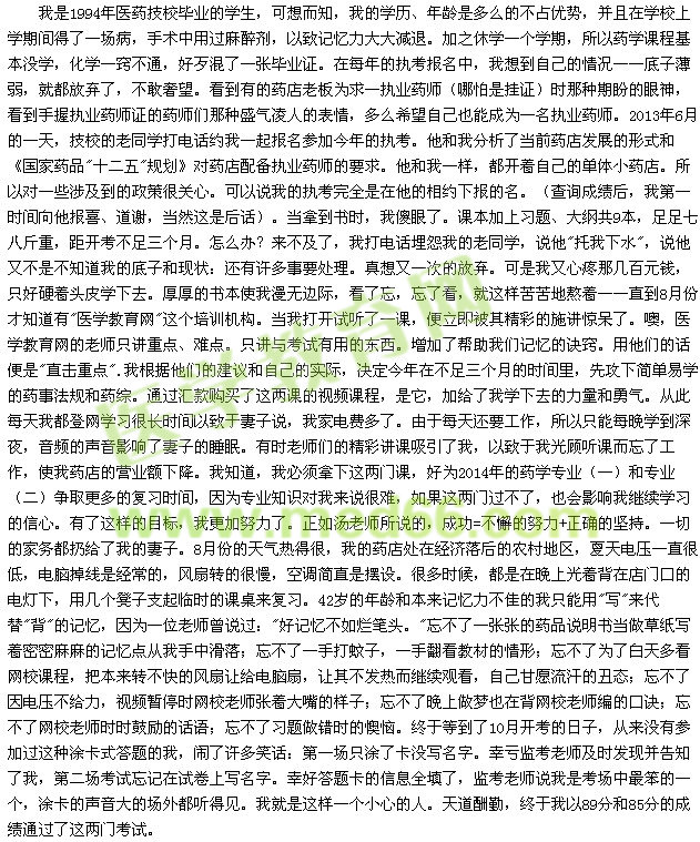 回想我的执考路,里面包含着辛酸、曲折,但我靠着那加给我力量的——医学教育网,我四科高分通过(2013年通过的药事法规89分,药学综合85分),成绩的取得,对于42岁的我实属不易,我感谢我的"卡比多巴"——(我的妻子)为我分担家务和工作;感谢医学教育网各位老师的精彩施讲,是他们给了我无穷的力量和执着的信念;感谢我信仰的上帝,帮助我,除去我执考路上的一切阻碍;感谢自己那种持之以恒的精神。下面是我的执考历程,愿与众位,特别是那些还没有参加执考的同学们一起分享。