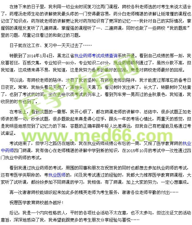 买书容易,决心易下,难的是我一名70后,已过了不惑之年,在平时的学习过程中,明显地感觉到了记忆力的下降,我明白走上了执业药师考试之路是对自己极限的挑战。我不知道会是什么结局,但我确实想证明自己,这是我最美的梦啊,我怎能不期待有一个完美的结局。