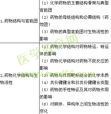 | (三)药学专业知识 | 药学分支学科及知识 | (1)药学专业分支学科(药物化学、药剂学、药理学、药物分析学等)和研究内容 (2)药学专业知识与执业药师专业知识结构的关系 |