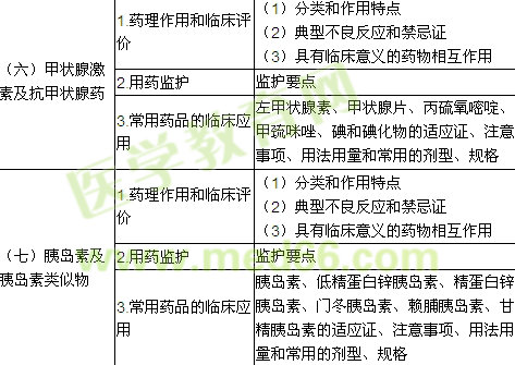 | (五)调节体内激素平衡的药物 | 1.药理作用和临床评价 | (1)分类和作用特点 (2)典型不良反应和禁忌证 (3)具有临床意义的药物相互作用 |