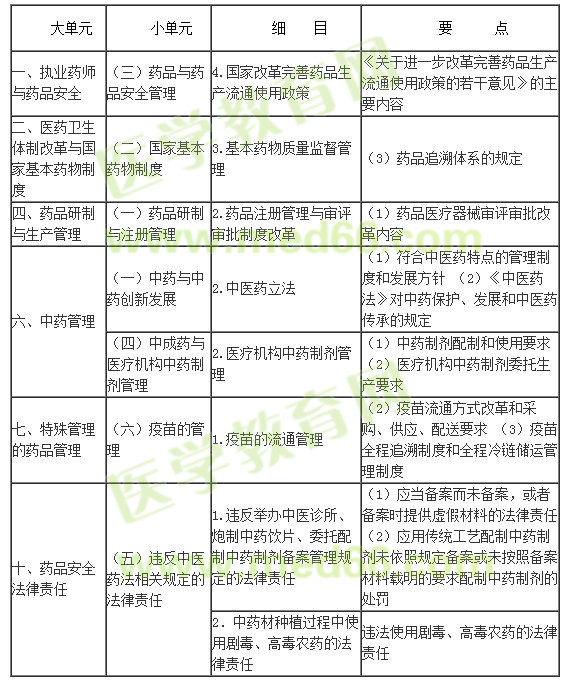(四)在第六大单元第一小单元中,增加细目“中医药立法”及要点“符合中医药特点的管理制度和发展方针”“《中医药法》对中药保护、发展和中医药传承的规定”;将第六大单元第四小单元“中成药管理”变更为“中成药与医疗机构中药制剂管理”,增加要点“中药制剂配制和使用要求”“医疗机构中药制剂委托生产要求”。