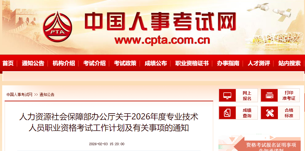 为切实做好专业技术人员职业资格考试规划与管理工作,方便广大专业技术人员参加职业资格考试,经征求有关部门同意,现就2026年度专业技术人员职业资格考试工作计划及有关事项通知如下: