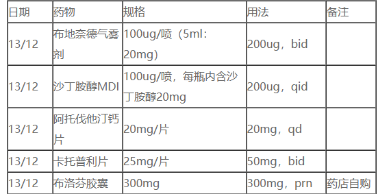 2.患者,男,45岁,身高175cm,体重80kg,既往有高血压、高脂血症和偏头痛病史。 近日因哮喘发作就诊,临床书写的药物治疗记录显示如下: