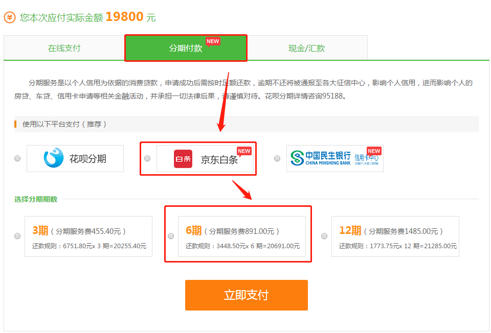 特别提醒:只有6期分期购买服务费为0元,其他期数暂时没有优惠。
