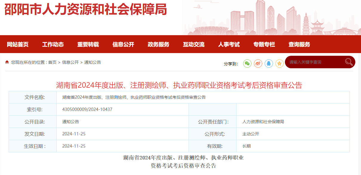 根据人力资源和社会保障部人事考试中心《关于印发〈专业技术人员职业资格考试报名证明事项告知承诺制工作规程〉的通知》(人考中心函〔2021〕1号)、湖南省人力资源和社会保障厅《关于专业技术人员资格考试实行考后资格审查的通知》(湘人社函〔2012〕526号)和湖南省人力资源和社会保障厅办公室《关于做好湖南省2024年度出版专业技术人员职业资格考试有关考务工作的通知》(湘人社考函〔2024〕6号)、《关于做好湖南省2024年度注册测绘师职业资格考试有关考务工作的通知》(湘人社考函〔2024〕2号)、《关于做好湖南省2024年度执业药师职业资格考试有关考务工作的通知》(湘人社考函〔2024〕5号)等文件精神,现将2024年度出版等三项职业资格考试考后资格审查有关事项公告如下: