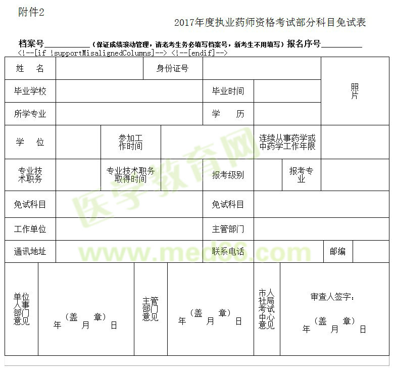 符合部分科目免试条件的需审报考人员进行现场报名资格审查时,还须提交部分科目免试表(附件)2份和相关免试材料(学历证、学位证、专业技术资格证书及聘任证书或证明、身份证等)原件及复印件2份。部分科目免试表可从网站下载,手工填写即可。