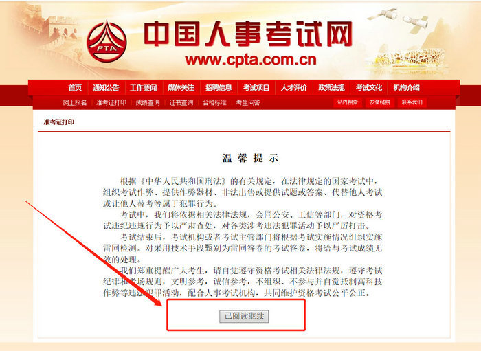 第一步:进入中国人事考试网,找到【准考证打印】入口,点击进入