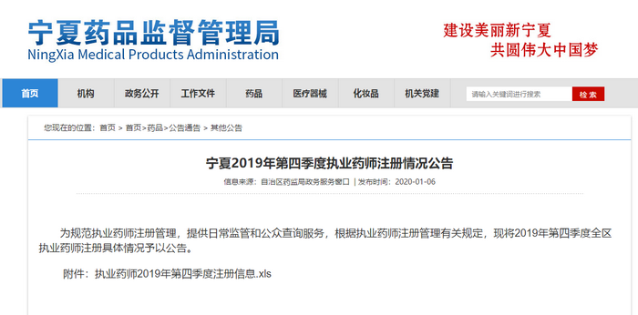 2020年1月6日,宁夏药品监督管理局公布了“宁夏2019年第四季度执业药师注册情况公告”,具体内容如下: