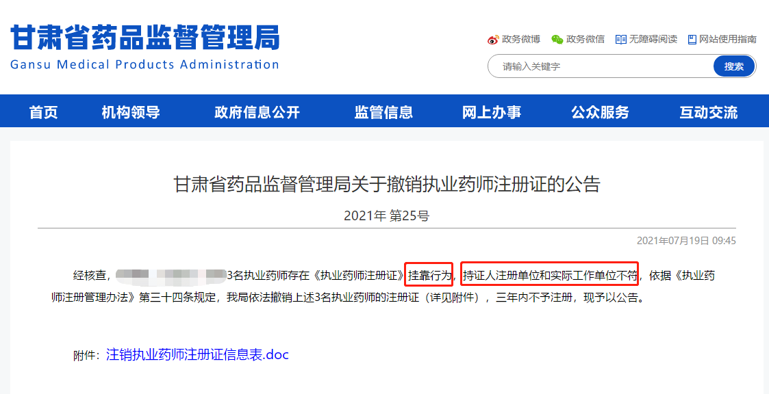 7月19日甘肃省药监局发布了一则公告,内容是三位执业药师存在行为,持证人注册单位和实际工作单位不符,因此撤销注册证,并且三年内不予注册。此前,甘肃省药监局还发布一人因虚假报考而强制注销一位执业药师的注册证的通知。由此引起了很多考生一阵惊慌,怎么考试通过成绩也不一定有效?怎么即使没有挂证,但还是可能被注销证书?