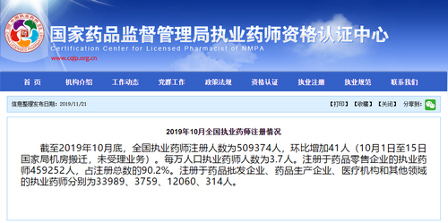 在11月21日,国家药品监督管理局发布了“2019年10月全国执业药师注册情况”,具体内容如下: