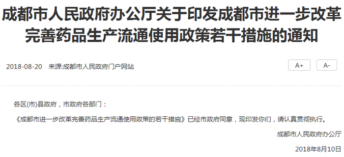 成都市人民政府办公厅关于印发成都市进一步改革完善药品生产流通使用政策若干措施的通知中表示: